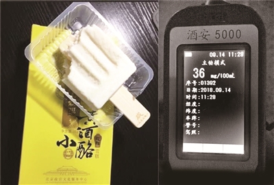 为此,记者带着雪糕来到某交警支队进行测试。记者吃进一小口黄酒小酪雪糕,在酒精检测仪上吹了一口气进行测试,酒精检测仪的显示屏上显示为36mg/100ml。现场交警告诉记者,判断酒驾的标准为数值是否在20mg/100ml以上,即每百毫升血液酒精含量大于20毫克,而醉驾标准则为80mg/100ml。约4分钟后,记者再次检测,此时检测仪上的数值则为0mg,说明通过检测仪已经测不出酒精。
