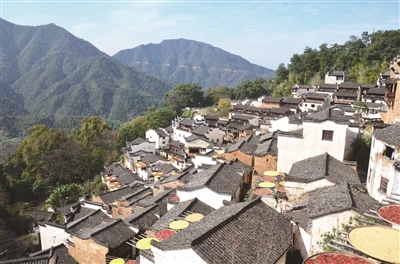沿着山路走近村口,大片“天然活化石”红豆杉水口林随山采形、就水取势,一下撞入眼帘。徽州人讲究风水,所谓的水口,指的就是村庄的出入口,受中国传统“天人感应”思想,古徽州人敬畏自然,认为草木繁盛可以护荫地脉,因此几乎每个村口都大量栽种树木,禁止砍伐,让生态林得到很好的保护,乃至今天我们看到这里巨树环抱,鸟兽栖息。