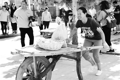 在游戏互动环节,首先开展的是推独轮车运物资接力赛。比赛过程中,大家推着放有竹筐、红辣椒、青菜等农业物资的独轮车,飞奔着向对面的队友跑去,队友接过小推车再折返原路跑回,每队参赛成员最先全部跑完的队伍获胜。随后,还开展了需要团队合作的传龙珠和旱龙舟比赛。