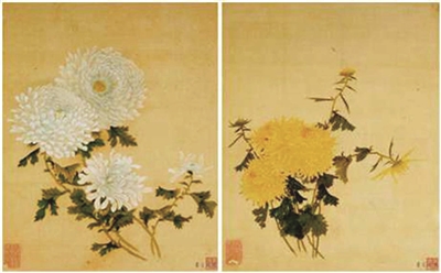 乾隆时期还有一件与菊花有关的大事,就是在1756年,有人向乾隆皇帝进献了“洋菊”。喜欢花的人,都爱奇花异草,像乾隆皇帝这样出了名的“好奇宝宝”,自然对这些外来的洋花喜爱有加。他下令让宫廷画师邹一桂进入内殿,画下这36种洋菊的图谱,自己亲自为每个菊花命名,还挥毫泼墨,题写在菊花图谱上。而后,画师邹一桂记下每株菊花的性状特征,集结成册,乃为《洋菊谱》。这“洋菊花”到底是从何而来?有的专家学者认为这些洋菊是从日本或是其他国家引进的,也有些认为是从南方地区引来的品种。