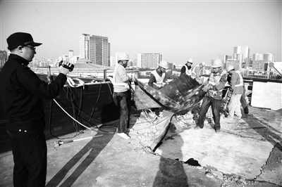 在聚龙花园小区8A楼楼顶拆除现场,七八名工人系着安全绳缆,对该楼楼顶的砖混结构别墅违建进行拆除。由于该违建位于7层楼顶,无法使用挖掘机等工具,工人们只能用锤子、电钻等一点一点地进行拆除。