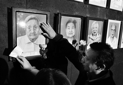 10月18日,张兰英的亲属在张兰英遗像(左一)前悼念。当日,侵华日军南京大屠杀遇难同胞纪念馆为最近去世的南京大屠杀幸存者张兰英、沈淑静举行熄灯、悼念仪式。新华社发