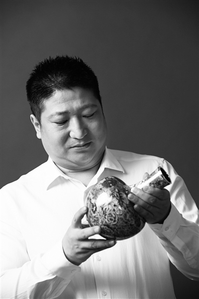 直到现在,已经成为企业总舵手的熊松涛,在统抓营销、设计、品牌、制作、渠道全面工作的同时,仍然坚持自己亲自设计、制作,与工艺师一起研究技术,开发新项目。熊松涛认为,好的设计是作品的灵魂。从图稿设计到修改到审定,一般会在二至三个月,有时还会历经半年,中间会经历很多次的修改,咨询专家,论证,查询资料,再审核的过程。有些重要定制品或者新开发的产品,熊松涛一定会采取先做样品试片,在试片中工艺成功、呈现的效果满意的,才会按定量制作。传统上,景泰蓝工艺大约有30多个步骤,‘熊氏珐琅’在改良创新之后,一共是53步。熊松涛说:“传统的珐琅一般是铜胎,也有金、银胎的,但很少,我们现在所设计制作的珐琅作品使用的胎底都是银胎。釉料的颜色上,过去景泰蓝是180-200多种颜色,我们现在已经增加到600多种颜色。而且新的颜色都是青金、和田玉、玛瑙、绿松石这种宝石类的颜料,研碎之后与钾钠长石进行融合而形成的颜色,所以玉质感和晶莹程度都高很多。”此外,熊松涛作品上面的细密纹理,很难让人想象是一刀一刀刻出来的。每一笔是一刀,一个瓶子要刻一个多月,但换回来的是瓶子的质感十足。据了解,这也是目前国内独家拥有的创新珐琅技术。