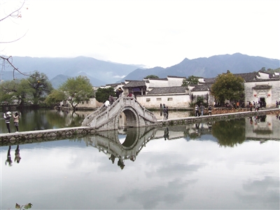 从永乐到万历年间,宏村迅速发展,人口骤增,房舍扩建,仅靠村中央的月沼之水已无法满足村民使用。于是,宏村村民通过商议,征用村南良田百亩,深掘数丈,砌石为沿,建成了巨弓形的南湖。后来,湖上又建起了一座玲珑的石拱桥,名曰“画桥”,大概是取如诗如画之意。
