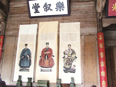 议事厅的正前方供奉着三位汪氏先祖,均为男性。在封建社会里,女子是不能入家族祠堂的,而汪氏宗祠里却供奉着一位女性祖先——胡重娘。宏村人为了纪念她在宏村规划建设中所作出的突出贡献,将她的画像与“巾帼丈夫”的匾额一同悬挂在祠堂中,供族人朝拜。这是对这位汪氏家族中的“巾帼英雄”最高的褒奖,游人至此,无不对这位“女汉子”心生敬意。