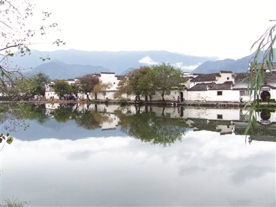 一入村口,南湖的美水便扑眼而来,清澈透明,水波荡漾,犹如一位清纯的村姑,笑迎八方来客。南湖是活水,因为“流水不腐”,南湖的水便显得十分清澈。粉墙黛瓦、古色古香的民居清晰地倒映在湖中,鸟儿自由飞翔,鸭子往来游弋,古木青青,杨柳依依,远山空蒙,云雾缭绕,如诗意,似画境。游人来了又走,走了又来,皆流连于这诗画般的仙境。清人汪士通有诗赞宏村曰:“家住桃源好,村居别有天。秋山千树月,春水一湖烟”。