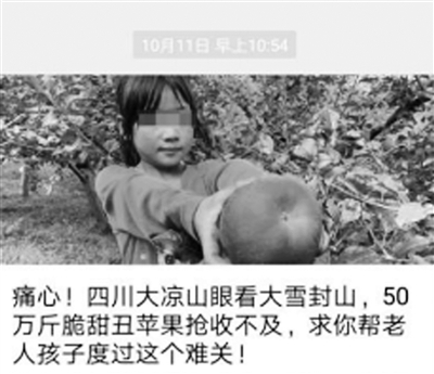 最近,一则关于四川凉山彝族自治州盐源县苹果的贴文在网络上引发关注,贴文称,眼看大雪封山,50万斤苹果来不及抢收,请大家伸援手买苹果。针对此事,凉山州盐源县政府紧急发布声明称,贴文内容严重不实。经调查,此贴文为广东的一家电商公司所发,该公司销售手段以卖穷卖惨为主,这种打“悲情牌”谋取利益的不正当营销方式,给大凉山和盐源苹果的整体形象造成了严重负面影响。(10月24日《成都商报》)