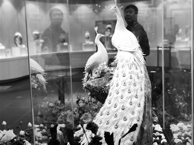 在综合展览馆,正在展出工艺花展览,这里展出了由专家学者、设计师、匠人、文创企业、非遗传承人等制作的,以“燕京八绝”和“民间九珍”、陶瓷、玻璃、金属、织物等为基材创作的优秀花卉作品,共计300余件,这也是2019年北京世园会工艺花展的预展。