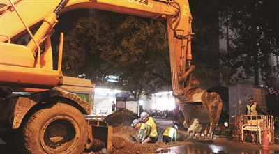 施工现场负责人介绍说:“我们可不是一口气就能把电缆从地底下拉过去,而是需要分别做好几个工作井,连接形成管线,就像缝针一样,一段一段地把管线从这头铺过去,由于刚刚启动土建工程,工作井挖多大、挖多深必须照图纸实施。”记者离开时已将近凌晨2点,工人们扔在车少人稀的午夜里挖坑埋线、拆线拔杆。