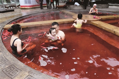 重庆一温泉近期推出“奇妙的红汤池”,直径6.7米的圆形汤池被改造成一口4格“铁锅”,配上红色的温泉,如同巨型麻辣火锅。 “火锅底料”是用鸡血藤、艾叶、红花、首乌等中药材加上红酒熬制而成,对人体有一定保健功能。汤池周边还陈列着盐罐、午餐肉、啤酒瓶等装置,水上漂浮着辣椒道具营造出麻辣火锅的浓烈气氛。图为市民正在泡“火锅”温泉。