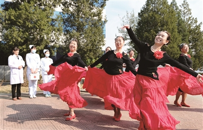 伴随着优美的旋律,三十多位老年人翩翩起舞,她们滑动舞步,抖动长裙,脸上洋溢着幸福的微笑。在她们身旁站着手提药箱的医务工作者。她们既是节目的第一观众,又是老年人的健康守护者。