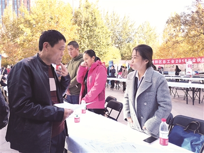 “我们是环保类企业,需要招收多个岗位的人才,您看看有没有适合您的,可以先做登记,再详细了解……”昨天,朝阳区总工会联合大屯、亚运村、望京、奥运村街道总工会在大屯文化广场共同举办2018年金秋招聘会。本次招聘会主要面向就业困难人员、失业待岗人员、大学毕业生、“4050”人员等就业群体,提供免费就业服务,涉及教育、策划、主管、会计、文员、服务员等多个行业,80余家企业共提供1000余个优质就业岗位。其中,不乏有热力集团、京港地铁、可口可乐、麦当劳、新世界百货、宜家家居等大型知名企业。