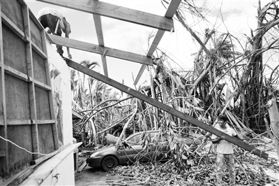 连根拔起的大树、墙倒窗斜的房屋、整排倒下的电线杆……超级台风“玉兔”侵袭后的塞班岛可谓满目疮痍。