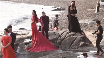 近日,在厦门环岛路上一处退潮后的海滩礁石上,美丽的海边风光吸引了许多新人们前来拍摄婚纱照。