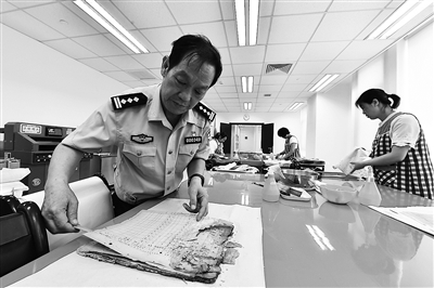 “只要这页纸上还有一个字,我们都会进行‘抢救’,有时上面缺了一角,即便能猜出是什么字我们也不能填上,要保持内容的原状,涂改后就失去法律效力了。”范三成是从事档案修复工作近30年的老民警,在修复室负责指导修裱档案。他告诉记者,修复室目前接收的主要是解放前北京城八区派出所保管的、损毁比较严重的居民档案。