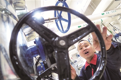 11月7日,全市区域供热锅炉房统一点火试运行。15日正式供热后,居民室温将保持在18℃达标温度以上。试运行期间,供热单位将进行锅炉点火、水循环系统热态调试,排查解决系统循环不畅和管线跑冒滴漏的问题,把问题解决在正式供热之前。图为热力集团职工正在调整一次放水管道阀门。