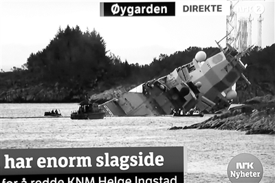 据挪威媒体11月8日报道,一艘挪威军舰和一艘在马耳他注册的希腊油轮当天凌晨在挪威西海岸附近相撞,造成军舰上8人受伤。 图为11月8日拍摄的电视截屏,显示发生撞船事件后的挪威海军“黑尔格·英斯塔”号护卫舰。 新华社发