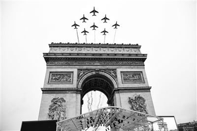 11月11日,法国政府在巴黎凯旋门前举行仪式,隆重纪念第一次世界大战结束一百周年。图为“法兰西巡逻兵”飞行表演队在纪念仪式上飞过凯旋门。 新华社发