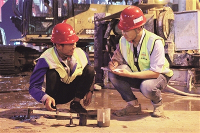 当时正是晚上,混凝土已到场,准备检测合格后浇筑白云路出入口咬合桩,而王子杰也早已准备好试验装备在现场等候。当混凝土从车上的漏斗流下来时,王子杰瞅了瞅,说:“这混凝土一看就是离析了,不合格。”“不可能吧?”现场很多人都不相信他一眼就能看出来。事实胜于雄辩,王子杰先做塌落度测试,结果为不合格;紧接着二次试验,还是不合格;最后还拿出手电筒,把倒在地上的混凝土翻来翻去地看,断定为粗骨料、细骨料分离。