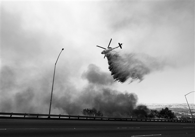 11月12日,在美国加利福尼亚州锡米瓦利,一架直升机参与灭火。美国西部加利福尼亚州两场山火11日持续肆虐,救援人员当天又找到6具遗体,死亡总人数上升至31人。 新华社发