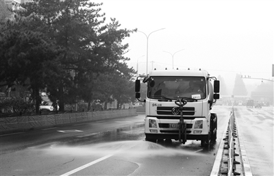 昨天,京城出现雾霾天气,很多市民放弃开车而选择公交绿色出行。一大早,环卫集团就出动车辆在全市各大街区洒水降尘,为市民出行创造良好环境。
