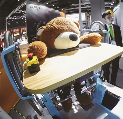 11月9日,在上海举行的首届中国国际进口博览会上,一只玩具熊被当成模特,模拟“体验”下肢康复训练机。