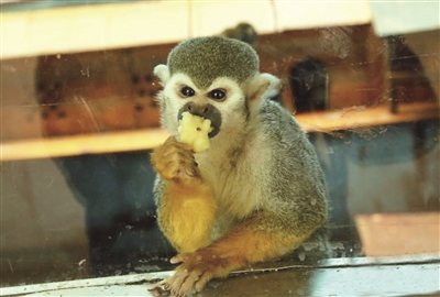 位于西宁的青藏高原野生动物园为园内127种“居民”丰富食物内容及造型,改善生活环境,添置滑梯等道具,供动物舒适过冬。图为松鼠猴在吃水果。