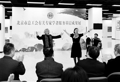 昨天,由北京市总工会主办的“专家学者服务基层成果展”在市职工服务中心开幕。参展的100多件作品涉及摄影、雕刻、歌曲、书画、剪纸等不同领域,集中展示了专家学者们送文化到基层的丰硕成果。图为歌曲展示受到现场观众的热烈欢迎。