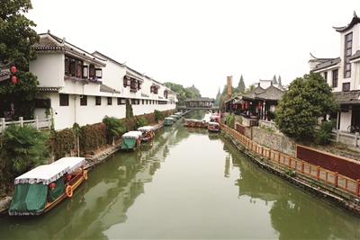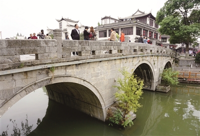 仰 望书有“三河古镇”字样的牌楼,跨入景区大门,映入眼帘的是一条小河环绕着古镇,清澈的河水倒映着人家,小桥横跨,小船悠悠。季节已入冬,但岸边歪斜的垂柳依然青绿,不禁感叹:好一派优雅的水乡风情!