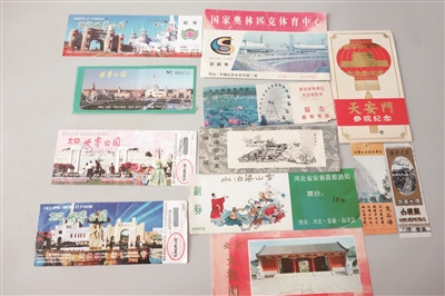 孙佑波去游览,各个风景名胜地的门票、游览票据,他都会收藏,很多朋友也把各种公园门票给他送来。其中丰台的世界公园,孙佑波就收藏了4个时期的门票,而在这些收藏的门票里,最久远的是1985年孙佑波去上海游览时的一张门票。那时候一张门票的价格还是1角。如今各个时期收藏的门票加起来,也有七八百张。