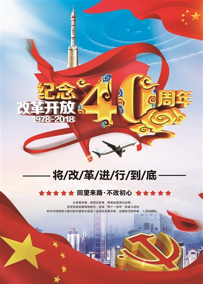 设计理念:采用党徽国旗寓意党政齐心,坚持改革开放,发展经济。蓝天下红旗与字体组合犹如号角吹响了改革开放的集结号。回望来路不忘初心。蓝天、红旗的对比让画面清新靓丽,金色的字体厚重沉稳。色彩绚丽,给人清新、向上的冲劲。