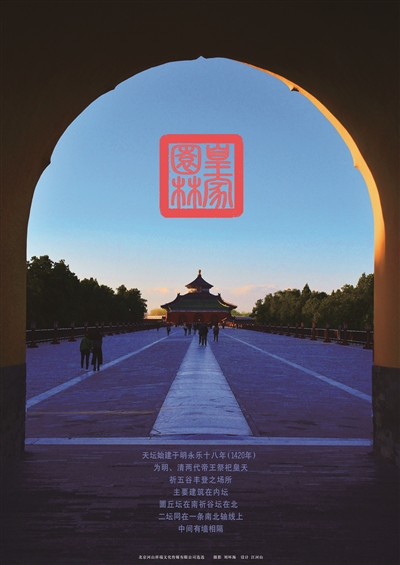 设计理念:由原创摄影作品设计,采用对称式构图体现了中国古建筑的端庄大气,文化底蕴丰厚。借助天坛古建、夕阳下、门洞中、远眺祈年殿;建筑、夕阳、蓝天交相辉映,用夕阳的暖色与蔚蓝的天空做主基调,强化了古建筑的风韵与厚重。