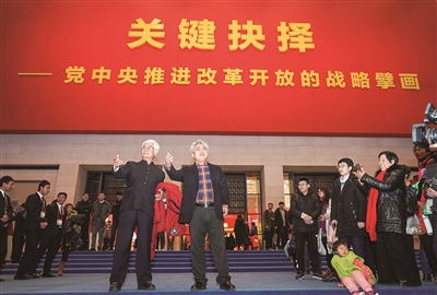 12月16日,中华文化促进会朗读专业委员会秘书长贺彩(前右)、全民悦读昌平阅读会主席周澂澧(前左)在 “伟大的变革——庆祝改革开放40周年大型展览”现场诵读诗词。当日,很多观众利用休息日来到中国国家博物馆参观“伟大的变革——庆祝改革开放40周年大型展览”。 新华社发