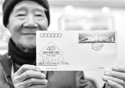 12月18日,82岁老“邮迷”常荣广在北京市西城区集邮营业厅展示他买到的、当日发行的《改革开放四十周年》纪念邮票首日封。该纪念邮票1套2枚,小型张1枚。邮票图案名称分别为高举旗帜、伟大实践,小型张图案名称为筑梦新时代,全套邮票面值8.40元。