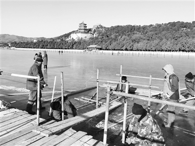 昨天,颐和园昆明湖上开始冰场围栏,预计搭建34万延长米,完成后冰场面积达70万平方米,是市区内最大的天然冰场,相当于98个足球场的面积。为保障安全,冰场设30名安全巡视员与应急小组。