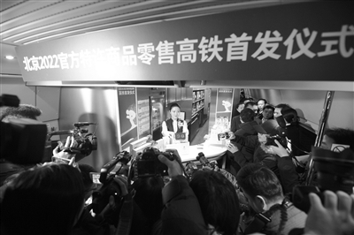 昨天,北京冬奥组委在中国铁路北京局高铁动车组列车0119次(北京南站至上海虹桥)上举行北京冬奥会特许商品首发式,标志着北京2022年冬奥会官方特许商品正式登上高铁列车,向高铁列车乘客销售。下一步将迅速推广至北京局其他列车销售。本报记者 彭程 摄影报道