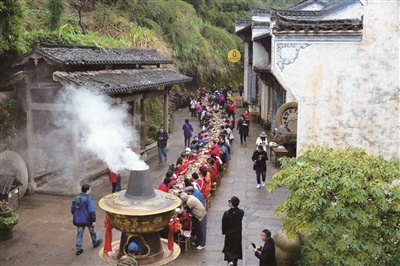 12月22日,农历冬至节气,江西省婺源县篁岭古村举行火锅宴庆祝丰收。高3米、直径2米的巨型紫铜火锅亮相古村,引得众人围观。当日,百米长桌火锅宴将古村的街道排得满满当当,来自新加坡和马来西亚等地的海内外宾客云集在此,共同分享盛宴。
