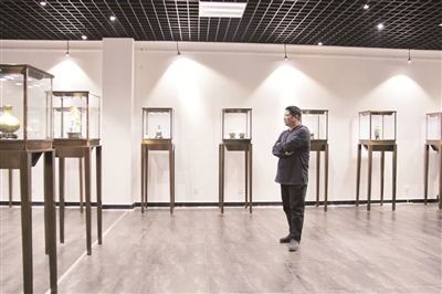 熊松涛还表示,过去的焊粉,都是把银质的大洋烧熔,配以铜和其他合金,进行勾兑后挫成粉末。而现在的焊粉,各种金属需要加多少比例更易熔化,也已经成为了“熊氏珐琅”的“秘方”。除一些独特秘方外,熊松涛还在工艺上达到了很多前人没有达到的高度。传统的釉料不透明,通过加入绿松石等玉石原料进行调整,熊松涛研制出了透明釉料;焊接的金丝银丝薄到打火机便能迅速烧熔,加入什么样的保护剂,使这道工序在气泵喷出的猛火中保持稳定,让丝与胎体迅速融合在一起,一样是熊松涛解决的难点;在打磨工艺上,现在的“熊氏珐琅”已经实现了用肉眼看不出划痕;而有效规避传统景泰蓝存在的“砂眼”问题,更成了“熊氏珐琅”的拿手绝活。对此,熊松涛解释道,“砂眼”指的是釉料里有气泡,在高温烧制过程中仍不易排出,在打磨过程中磨破了,而传统的景泰蓝,“十蓝九砂”。熊松涛除在釉料的结晶度上做了文章,还实现了让“砂眼”最小化,让肉眼很难看到。这道工艺,熊松涛谈起来充满成就感:“在这个行业内,除了我们,没有人能够解决。”而这些用时间和双手练就的成就感,也把熊松涛与景泰蓝牢牢地拴在了一起。“可能从事其他行业能够创造很多财富,可是在这一行内,我有着别人体会不到的乐趣。”熊松涛认为,只有在一门手艺上取得成就,抑或是想要开辟些新领域,才是让手艺人产生兴趣、调整工艺的“良方”。