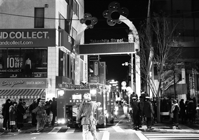 日本一名年轻男子1月1日凌晨驾驶汽车闯入东京原宿一条禁止车辆通行的繁华街道,故意撞伤8人,其中一人伤势严重。图为消防队员进入事故现场。 新华社发