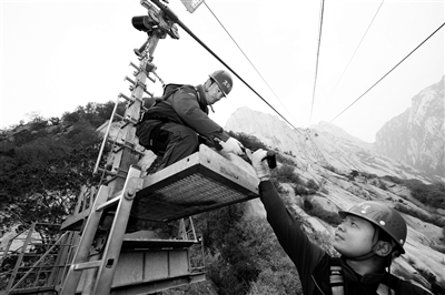 从太华索道运营开始,张新建和梁斌就做着检修工作,几年下来,除了练大了胆量,更学会了细心。张新建说:“我们的工作关系着千万人的安危,把手里的工作做好,把每位游客安全送到山上山下,是我和其他索道检修兄弟们最大的心愿!”图为张新建(右)和梁斌准备登上华山太华索道支架进行支架检修。