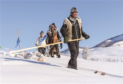 过去11天,九位家住阿尔泰山区的牧民,踩着毛皮滑雪板,从新疆哈巴河县白哈巴村出发,沿着阿尔泰山中段南麓一路东行,向着终点新疆阿勒泰市将军山进发,总行程超过300公里,其中三分之一的路段属于无人区。图为参与毛皮滑雪之旅的牧民玛力琴(前)和队友们行进至新疆布尔津县禾木村附近。 新华社发