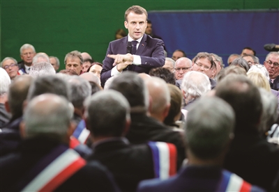 法国总统马克龙1月15日在法国西北部厄尔省正式启动将持续两个月的全国辩论,以凝聚法国社会对推进改革的共识。据法国总统府消息,马克龙在厄尔省和来自诺曼底大区的数百名市长就公务员体制改革、税收改革、财政支出等多个议题进行了长达约7小时的探讨,以这种形式开启全国辩论。图为1月15日,在法国西北部厄尔省,法国总统马克龙(中)在与数百名市长的集会中发言。新华社发