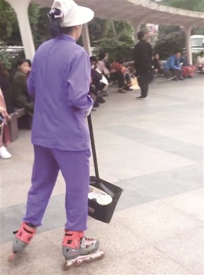 近日,成都一医院保洁阿姨穿着轮滑鞋清扫路面垃圾的视频在网络走红。保洁公司工作人员接受采访称,由于清洁范围大,穿轮滑鞋能提高保洁工作效率。而且这位阿姨还是经过公司轮滑培训的,虽然四十多岁了但滑起来得心应手。