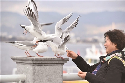 近日,众多市民和游客来到滇池边,观赏前来越冬的红嘴鸥,绘制出一幅冬日里“春城”昆明的别样美景。图为一名市民与红嘴鸥亲密接触。