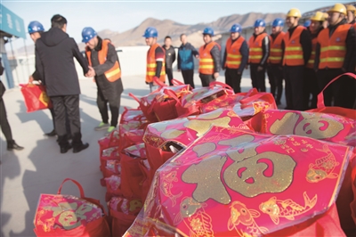 郭盛兴是项目的一名电工,来自福建福州,到项目半年多。他家有4口人,孩子12岁正上初中。“项目发了我们一个大礼包,还买了土特产和小礼物带回家。”提着大礼包,郭盛兴笑得合不拢嘴。