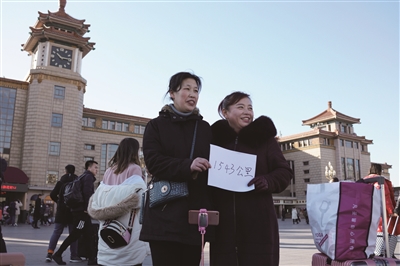 家乡在东北的林女士在北京打工,“老家离北京1543公里,很久没回去了,非常想家和孩子。”在异乡工作了一年,如今买了丰厚的年货踏上回家之旅,林女士非常高兴,特地在纸上写了归家的公里数在站前留影。