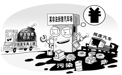 目前,我国每年报废汽车数量以百万辆计。根据国家报废汽车回收管理办法,取得资格认定才能回收、拆解报废汽车。记者近期在江苏省连云港市东海县桃林镇暗访发现,当地数百户、上万人从事非法拆解报废汽车生意,形成非法购买、拆解、翻新和售卖的利益链条,国家严禁交易的报废车“五大总成”甚至整车流向全国。(1月21日新华社)□朱慧卿