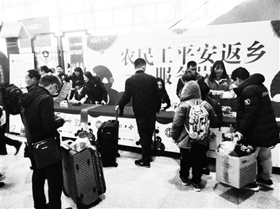 “心里感到暖暖的,感谢工会为我们返乡提供便利的服务。”1月21日,成都市总工会在换乘集中的东站汽车客运站为返乡农民工提供面包、牛奶、春联福袋等新春礼品,同时开通农民工专用通道和农民工购票专用窗口,帮助农民工朋友们平安返乡。(1月23日《四川工人日报》)