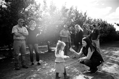 图为2018年9月10日,在美国俄勒冈州波特兰市南部威拉米特河谷,科尔曼家族果农埃米(前右)一家三代人聚集在自家果园里。据新华社