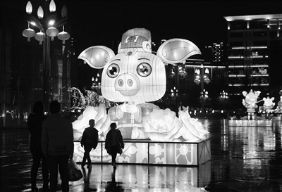 1月30日,人们在贵州省仁怀市市民休闲广场观看生肖猪彩灯。春节临近,各地彩灯流光溢彩、璀璨夺目,营造出浓浓的喜庆气氛。